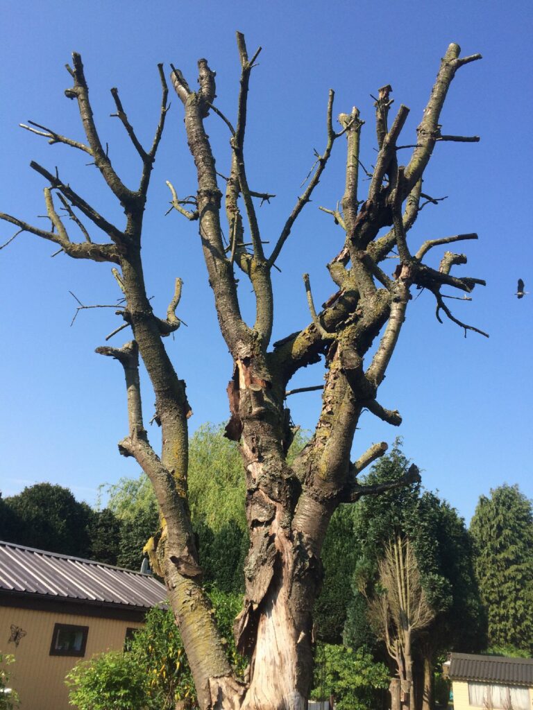 Een verzwakte “boom”, droge lente, hete zomer en helaas verlies je dan bij deze soort gokwerken. Het juiste moment om te snoeien is nadat de boom weer op gang komt, en voor deze kerselaar was dat zelfs na de vruchten dracht.
